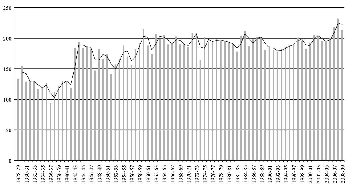The period examined through this study starts in 1928, when the modern history of the orchestra began, and reaches up to 2009, when its previous conductor's service was completed. Even, at a first glance we can draw some conclusions. We can clearly notice the impact of the great recession which hit the United States during the 1930's, followed by the outbreak of World War II. The involvement of the United States in the war did not affect the performances of the orchestra in a negative way. On the contrary it is associated with a rapid increase on the activity of the orchestra between 1941-1944. It seems that the American audience was rather indifferent toward what was happening in the European continent. From the early '60s up to our time, the frequency of the orchestra's performances was maintained more or less the same, with an average of 195 concerts per season. In other words, between two concerts of the orchestra, there is a gap of less than one day on average. If we take out the time for the required rehearsals and the time spent travelling to different cities or countries during the tours, we realize that the orchestra is in constant activity. At this point, it should be stressed out that none of the charts shown here, was taken directly from the orchestra's archives. Data have been previously processed in some way, in order to generate what is shown here. In the case of the annual number of concerts, for example, the data derived from more than eight thousand programs, which correspond to more than fourteen thousand concerts.