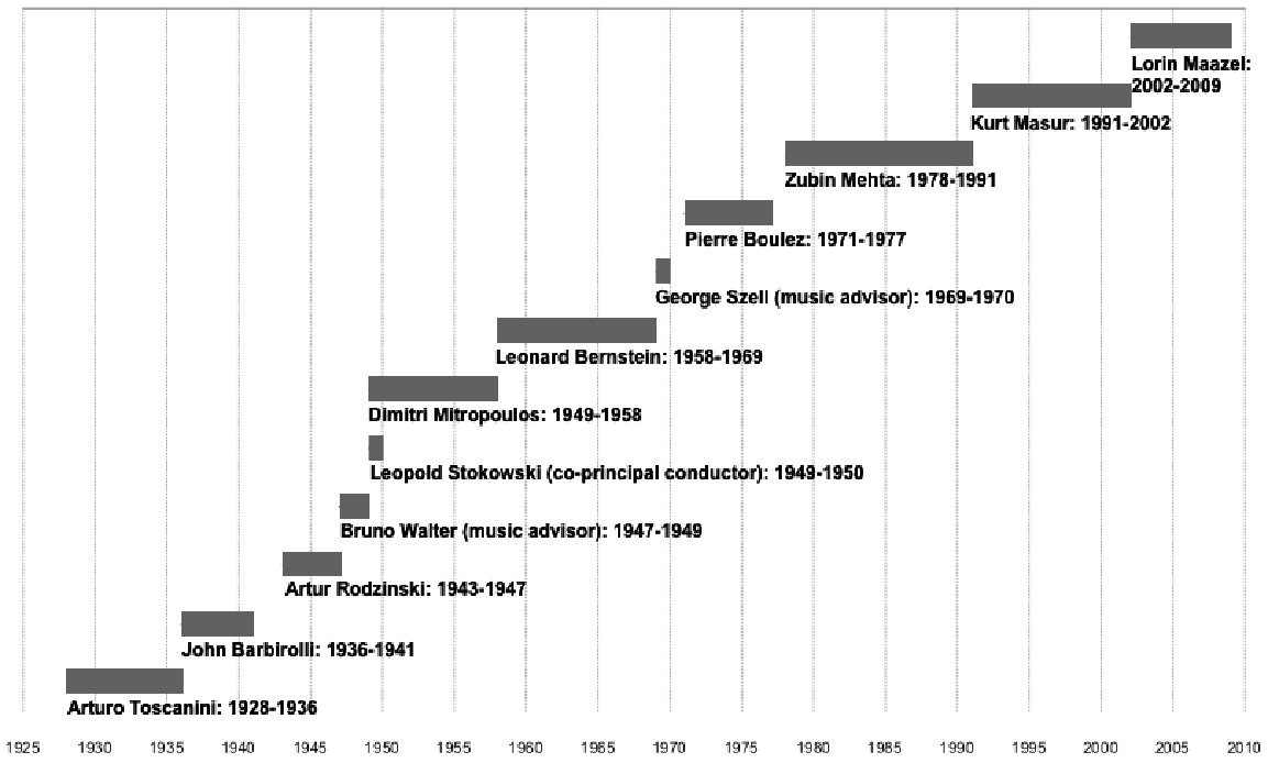 The conductors examined are the following: Arturo Toscanini, sir John Barbirolli, Artur Rodziński, Bruno Walter, Leopold Stokowski, Dimitri Mitropoulos, Leonard Bernstein, George Szell, Pierre Boulez, Zubin Mehta, Kurt Masur and Lorin Maazel. As observed, from 1941 when Barbirolli left the orchestra, until 1948 when Mitropoulos took over, many new faces appeared on the podium. The short service of new conductors, the fact that the orchestra had no principal conductor for a time, as well as positions such as "co-principal conductor" and "music advisor" that were invented, if not prove, at least provide evidence that the orchestra was in a constant search.