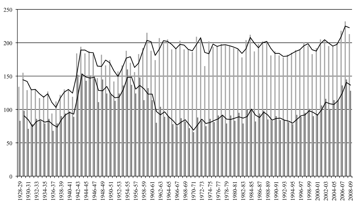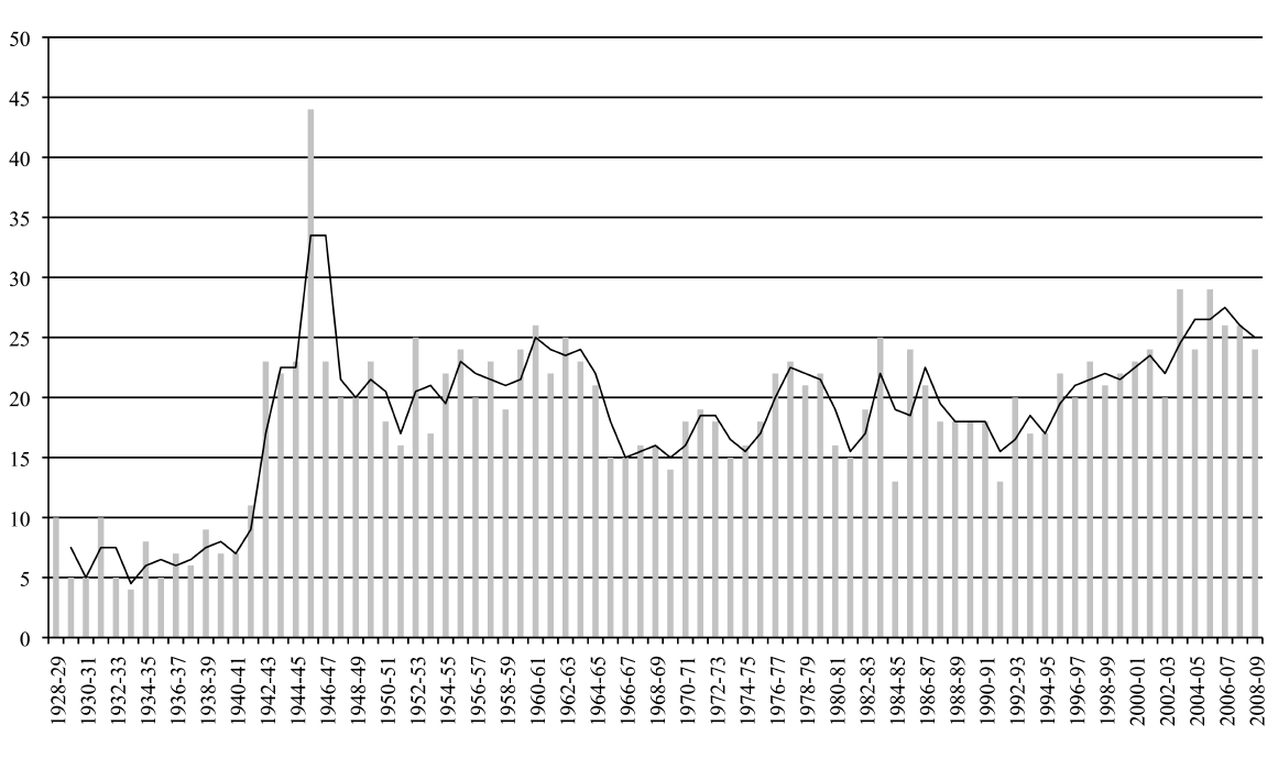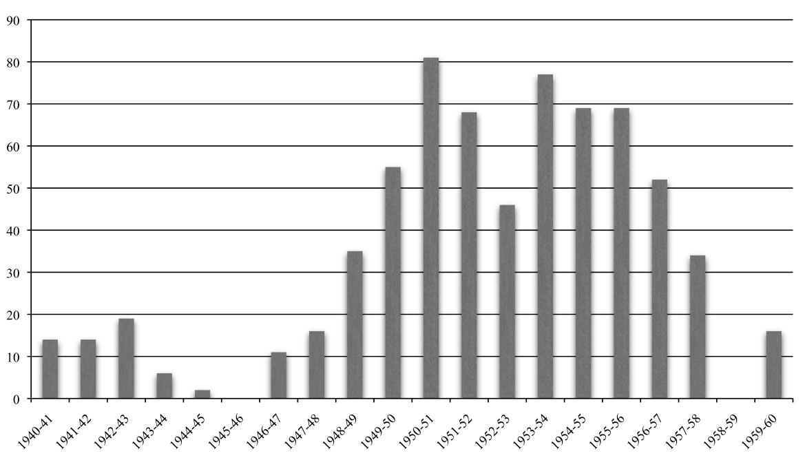 An important conclusion has to do with the frequency of a program's repetition. Sometimes the same program is performed on more than one concerts. The repetition frequency of the programs, vary by season. There are two distinct periods regarding the repetition frequency of the programs: the first period is until the 1957-1958 season and the second from that season up to our time. It is evident that in the first period the repetition frequency of the same program is less comparing with the second, where we observe an "industrialization of production." The fact that the change occurred at the same time with the termination of Mitropoulos direction, might not be irrelevant. The narrow "path" observed in the period 1939-1945 is due to the large number of guest conductors, which was discussed earlier; as expected, the programs of guest conductors had a small number of repetitions. It seems that during the Mitropoulos direction, emphasis was given in presenting original programs.