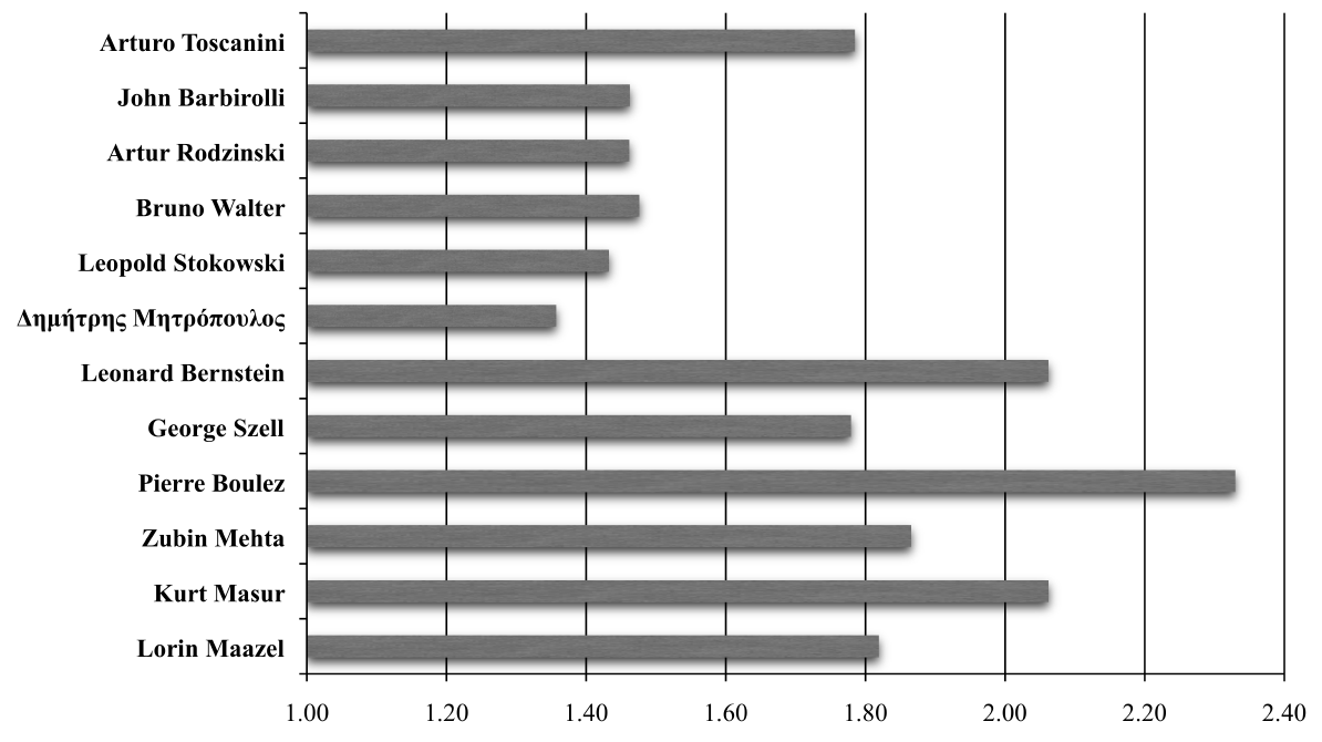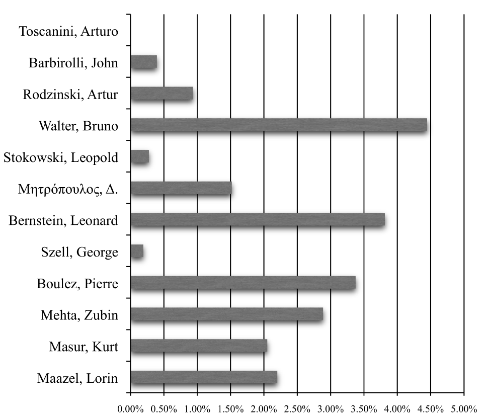 The artists selected for comparison were the conductors who took a leading position in the orchestra; those who where appointed as directors of the orchestra, principal conductors, or held similar posts. As expected, these conductors had the higher number of appearances with the Orchestra. Moreover, their choices in the repertoire represent the character of the orchestra and the opinion of the Board (that hired them).