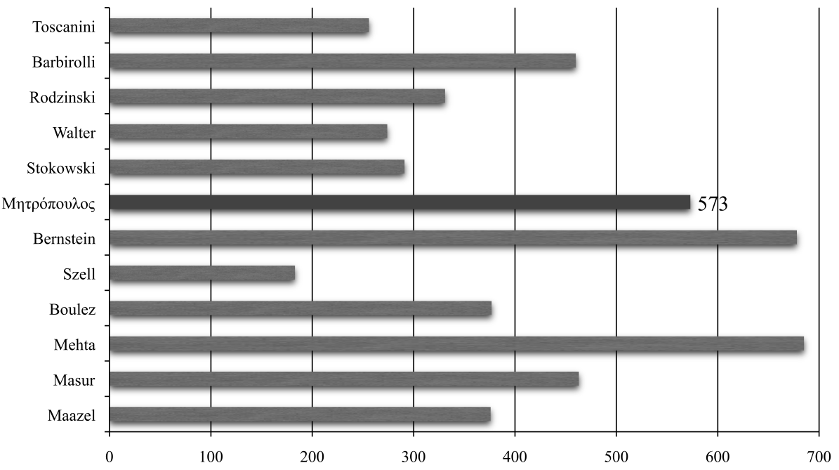 This assumption is confirmed by comparing the repetition frequency of programs among the other principal conductors of the orchestra. Mitropoulos holds the lowest rate, with an average of 1.36 repetitions per program. The originality of the Mitropoulos programs certainly required a larger number of rehearsals. If we also take into account that the maestro directed the works from memory, we conclude that Mitropoulos was one of the hardest working conductors of the orchestra. However, hard work and dedication to his "mission", had a fatal impact to his health. Alas, fifty years later, his country was going to be stigmatized for laziness.