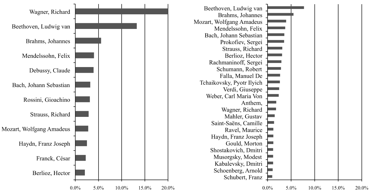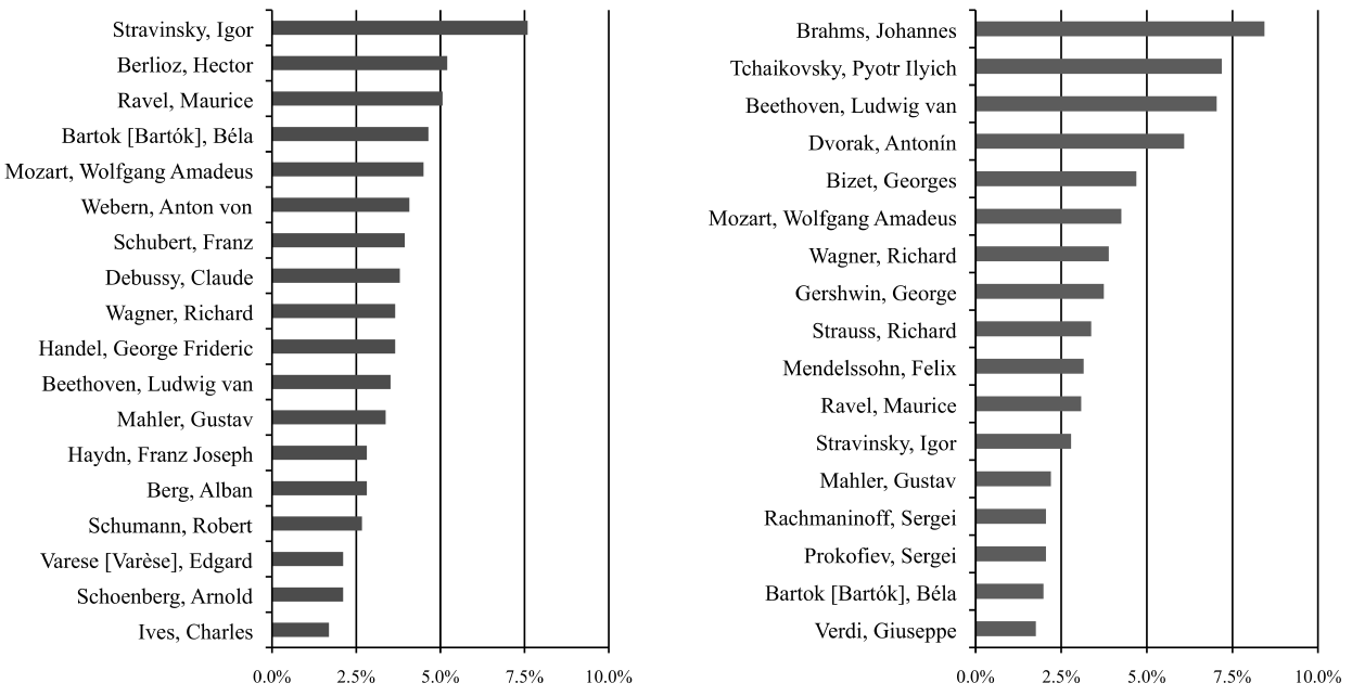 Table 10: Composers in Toscanini (left) and Mitropoulos (right) repertoire on the ⅔ of executions